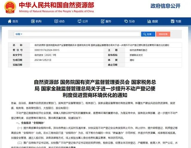 2月1日,自然資源部、國務(wù)院國有資產(chǎn)監督管理委員會(huì )、國家稅務(wù)總局、國家金融監督管理總局發(fā)布關(guān)于進(jìn)一步提升不動(dòng)產(chǎn)登記便利度促進(jìn)營(yíng)商環(huán)境優(yōu)化的通知。